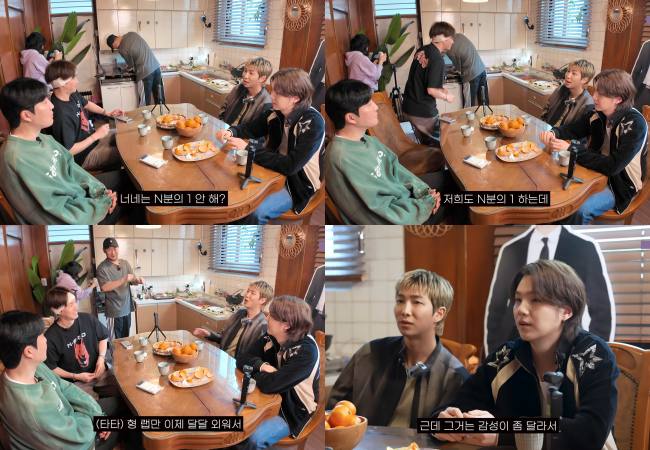 Di samping kisah-kisah tersebut, muncul pula topik lain yang tidak kalah menarik—yakni mengenai hubungan antar anggota, khususnya siapa yang paling mereka percaya dan andalkan saat menghadapi masa-masa sulit. RM memulai pembahasan dengan menyebut bahwa Suga cenderung menganggap Jimin sebagai “boneka beruang penopang emosional.” Ia bercanda, “Setiap kali selesai latihan tari, dia akan bertanya kepada Jimin, ‘Mau pergi ke sauna bersama?'”